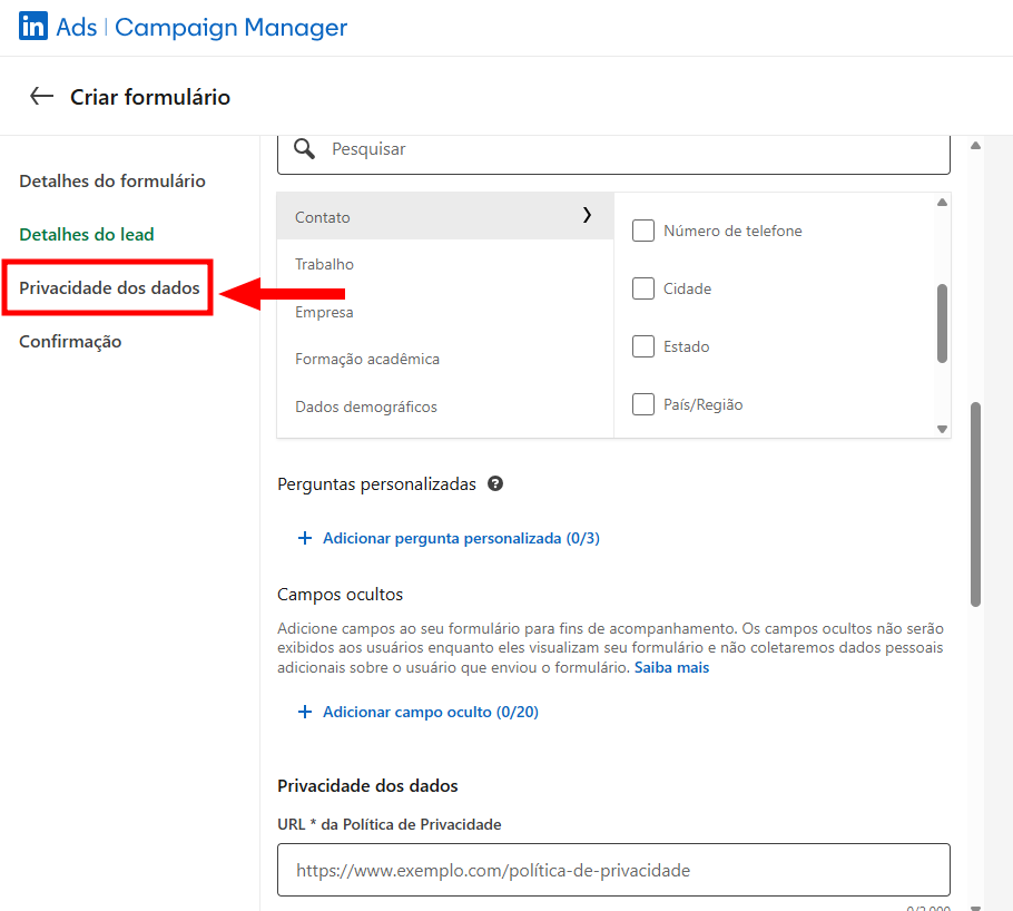 6. Após personalizar o formulário, clique em "Privacidade dos dados".
