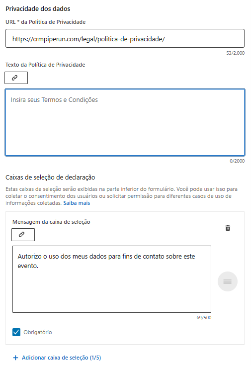 Caixas de seleção de declaração: essas caixas aparecem na parte inferior do formulário como checklists de consentimento. Podem ser usadas para pedir autorização específica ao lead.
