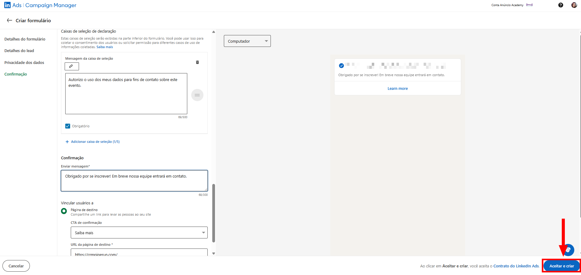 9. Após configurar o formulário clique em "Aceitar e criar".