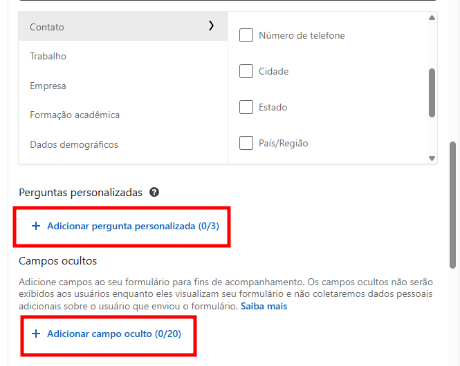 É possível adicionar perguntas personalizadas ao seu formulário e também campos ocultos que não aparecem para o lead durante o preenchimento mas podem ser enviados para o CRM de Vendas PipeRun.