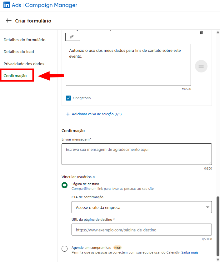 Na etapa Confirmação do formulário de captura de leads no LinkedIn Campaign Manager, defina o que será exibido ao usuário após ele enviar os dados. Os campos são: