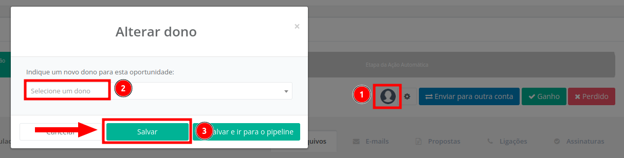 R: Verifique se a Oportunidade relacionada a este documento possui um dono de Oportunidade cadastrado. Para cadastrar o dono da Oportunidade clique na imagem ao lado do ícone de engrenagem (1) e, depois, clique em "Selecione um dono" (2). Após informar o novo dono, clique em "Salvar" (3).