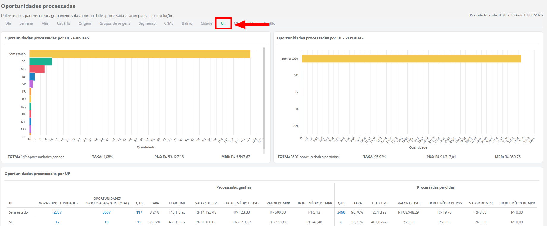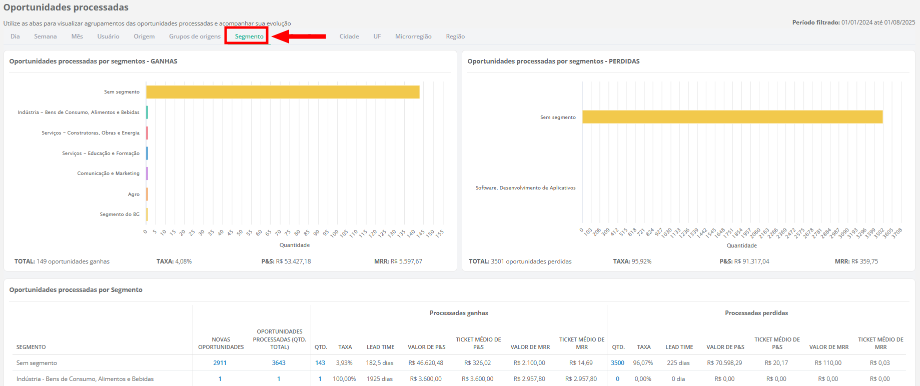 - Quantidade de novas oportunidades, ganhas, perdidas, congeladas e em aberto, incluindo o somatório dos produtos e serviços (P&S) e das recorrências (MRR);