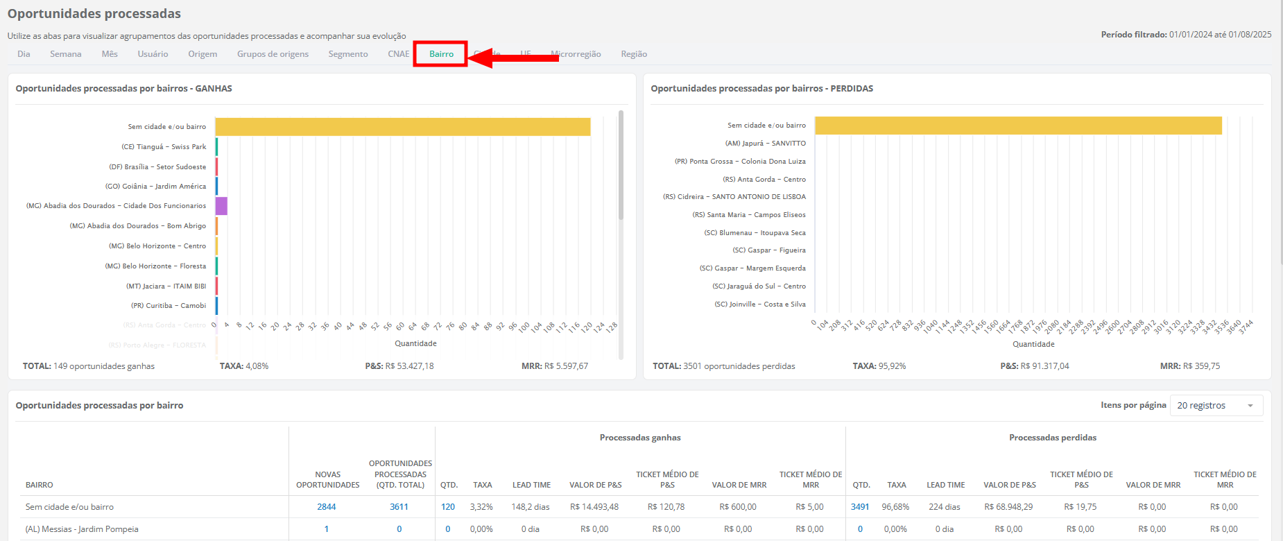 Bairro: exibe a distribuição das oportunidades por bairro;