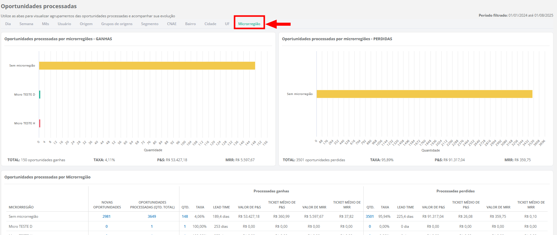Microrregião: permite a visualização em gráfico e em listagem das oportunidades cadastradas e processadas separadas por microrregião;