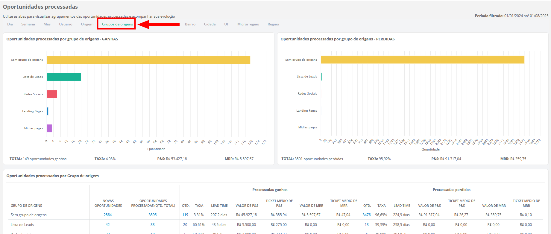Grupos de origem: permite analisar os dados considerando conjuntos de origens agrupadas previamente no sistema;