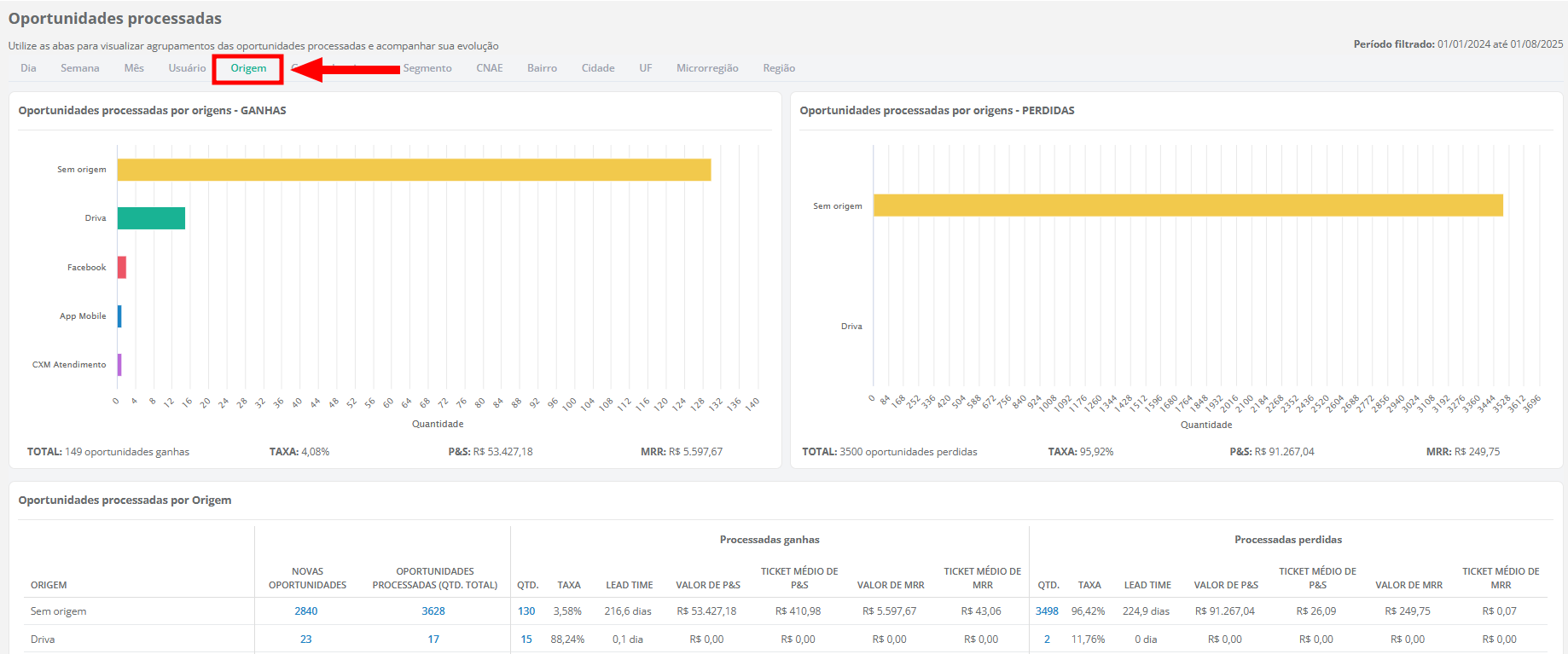 - Origem: selecione uma ou mais origens para filtrar o relatório;