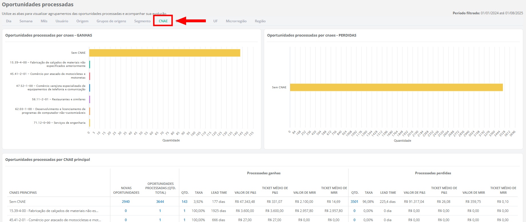 CNAE : classifica conforme o código da Classificação Nacional de Atividades Econômicas vinculado ao cliente ou oportunidade;
