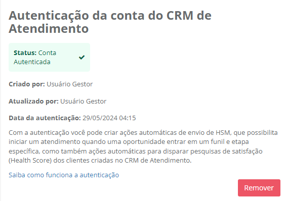 Nesta aba é possível autenticar a sua conta do CXM de atendimento, para a criação de ações automáticas de envio de HSM e disparo de pesquisa no CXM de atendimento.