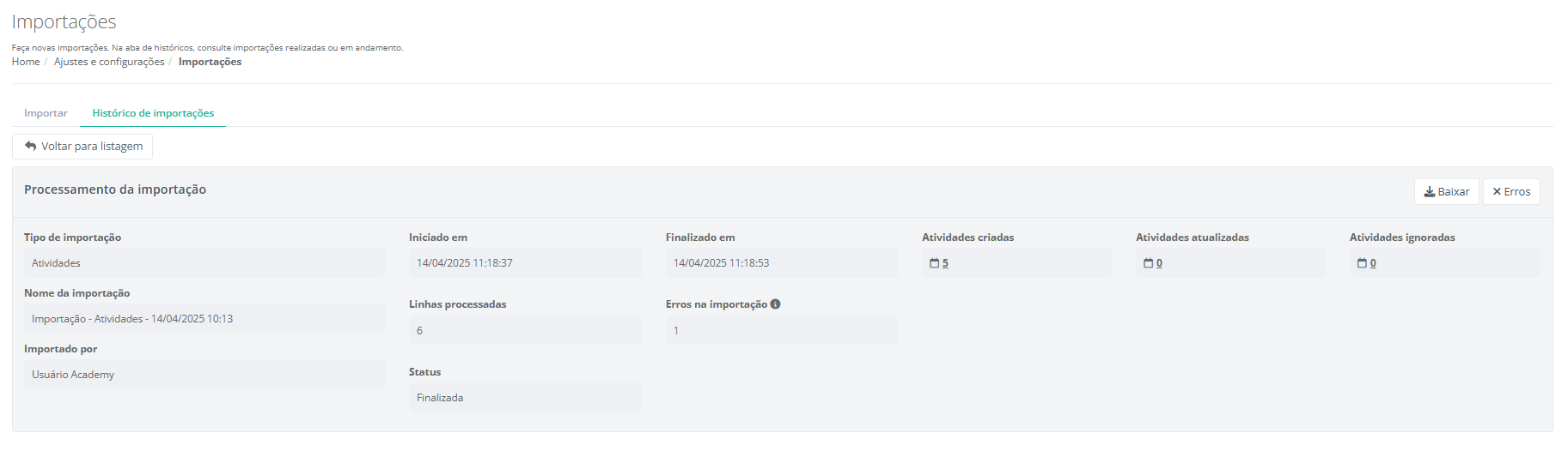 Dica: você poderá visualizar o andamento da sua importação no histórico de importações. Após ser finalizada, é possível verificar informações como usuário responsável pela importação, data de início e fim da importação, erros ocorridos, e quantos atividades foram criados, atualizadas ou ignoradas.