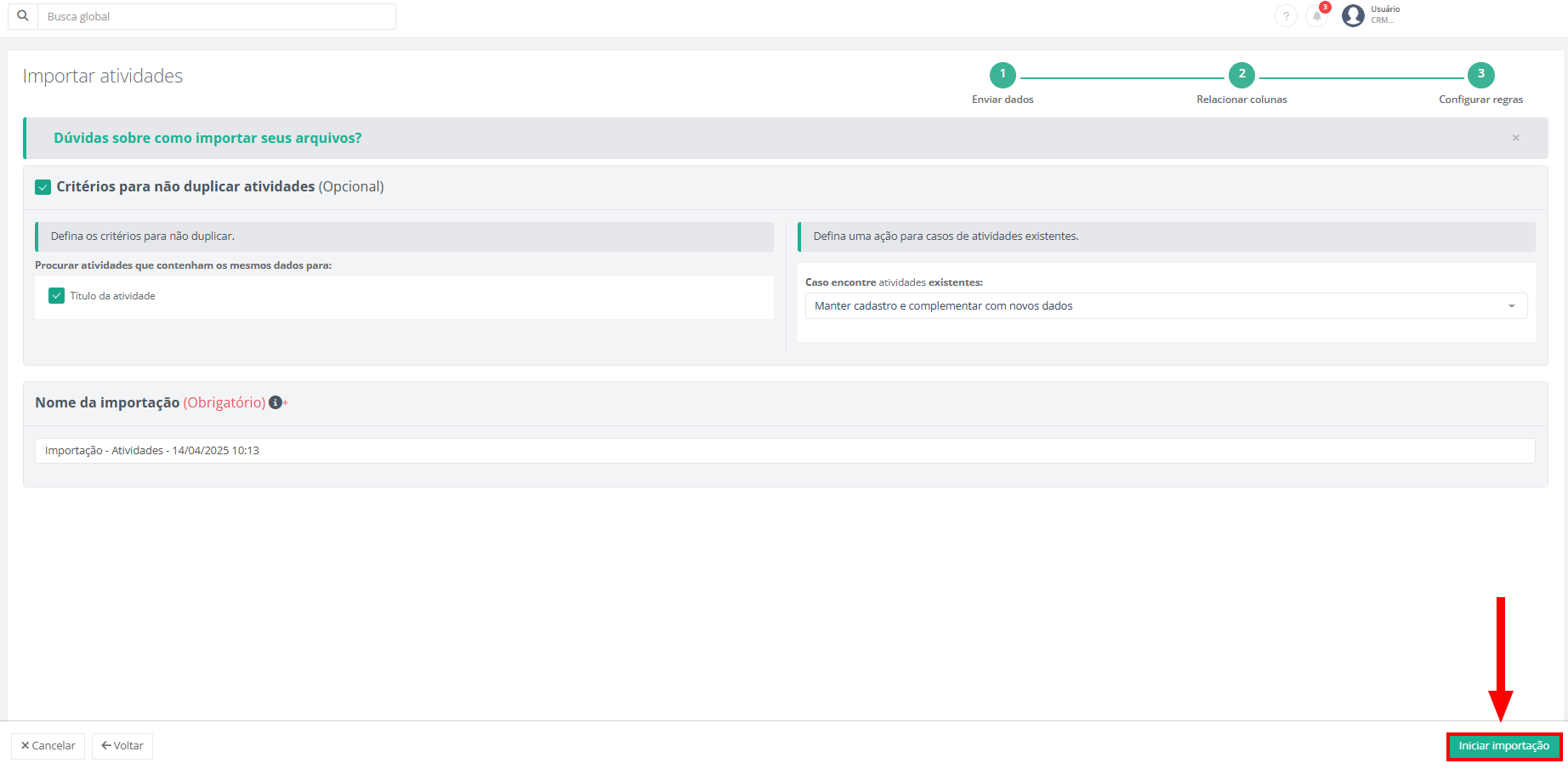 A importação de atividades possui três passos, sendo eles: envio de dados via planilha, relacionamento de colunas da planilha e configuração de regras da importação.