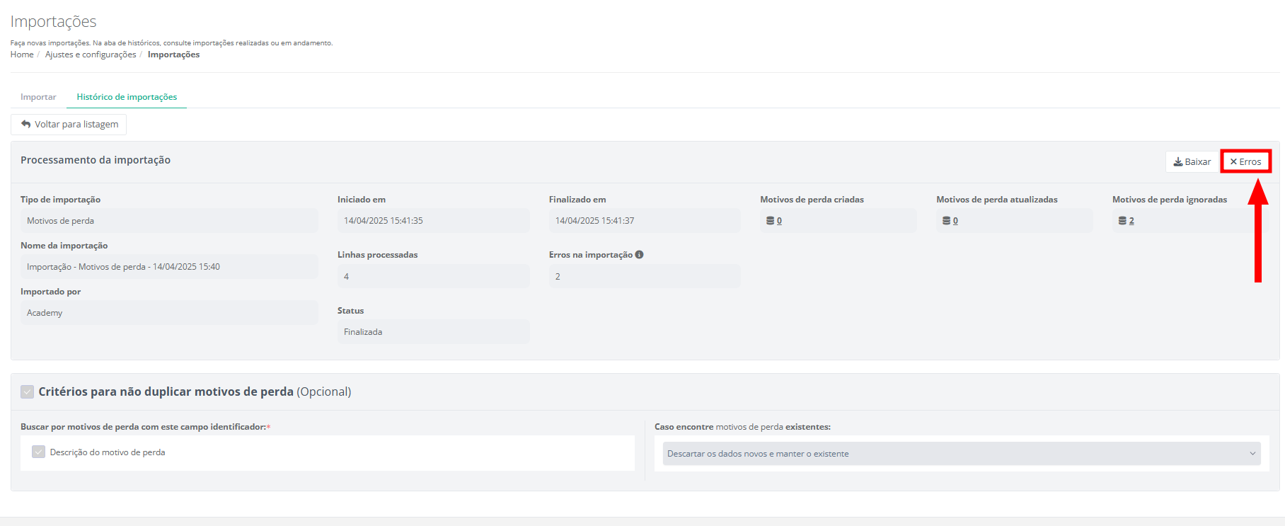 2. Defina a ação a ser tomada caso, durante a importação, sejam identificadas motivos com a mesma descrição na planilha de importação.