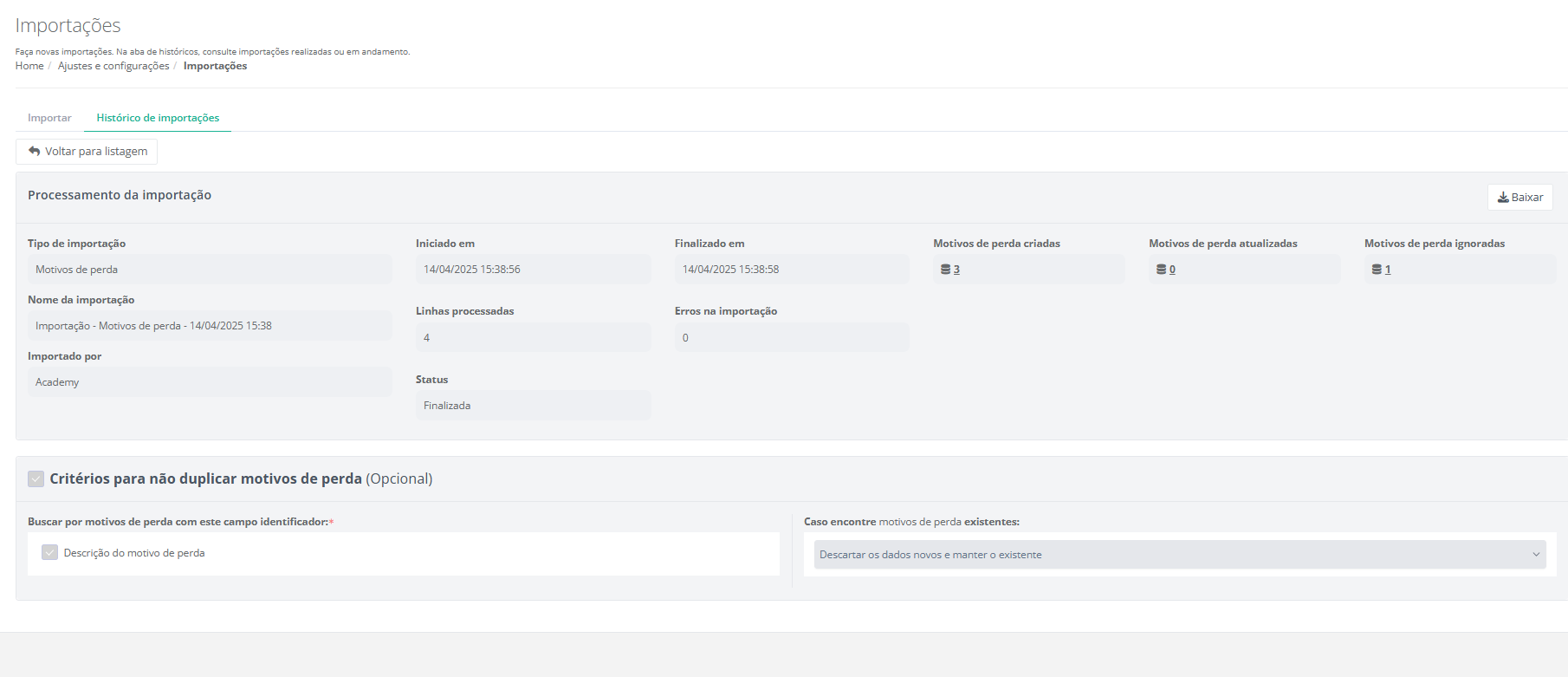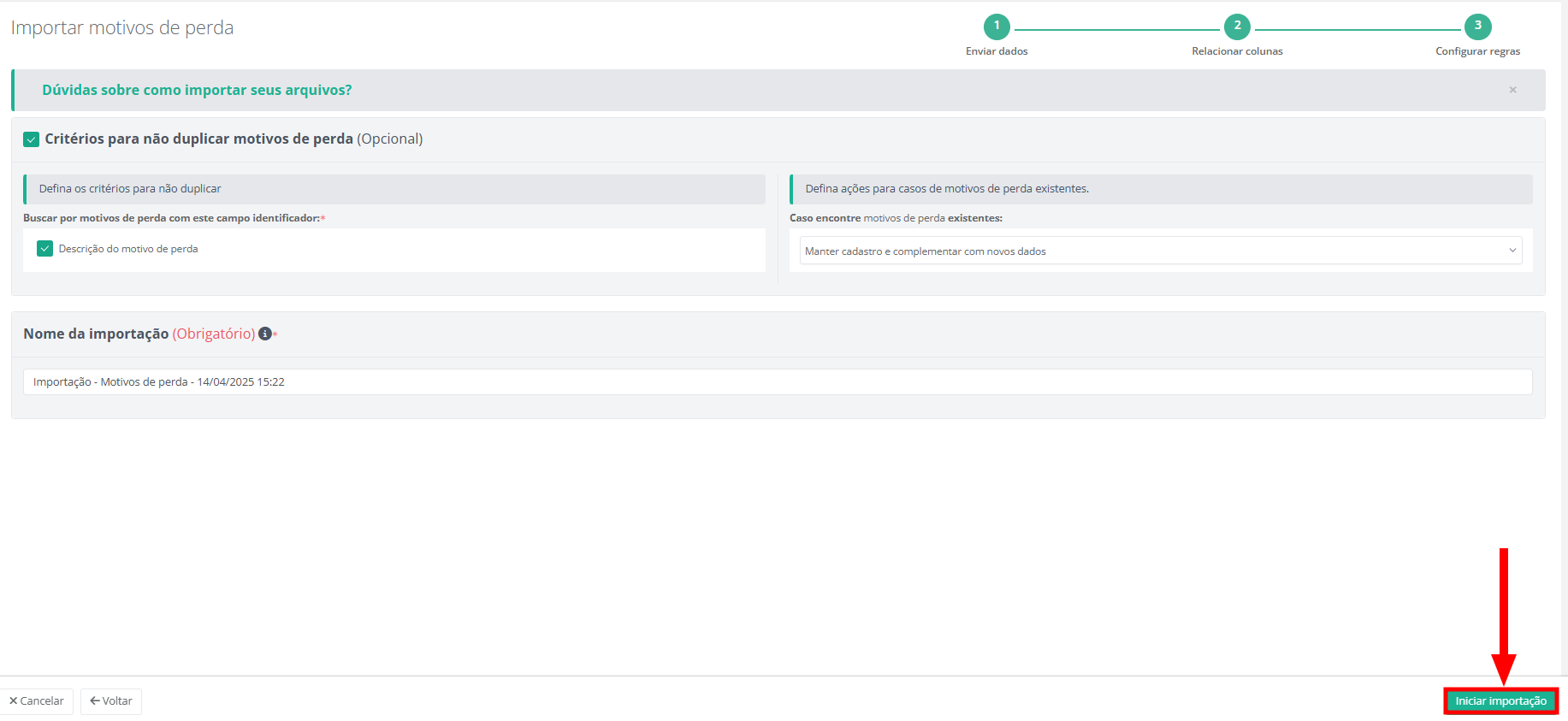 3. Defina um nome para a importação. Automaticamente o sistema irá sugerir um nome como: Importação - Motivos de perda - DD/MM/AAAA HH:MM.