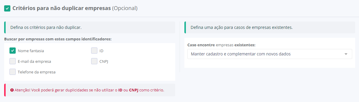 Atenção! O ID da empresa só estará disponível na exportação de dados de empresas. Utilize esta opção caso deseje utilizar a importação para enriquecer os cadastros já existentes.