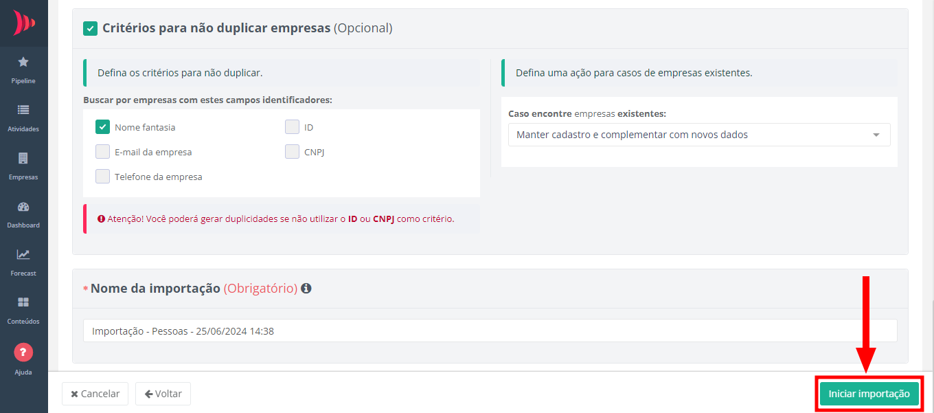 - Realizar o enriquecimento de dados a partir do CNPJ cadastrado: marque esta opção caso tenha informado o CNPJ da empresa na planilha de importação;