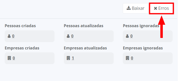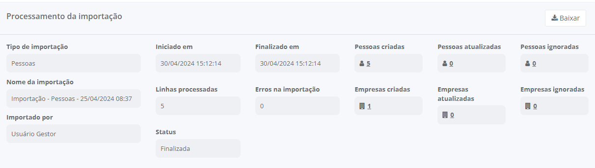 Dica: você poderá visualizar o andamento da sua importação no histórico de importações. Após ser finalizada, é possível verificar informações como usuário responsável pela importação, data de início e fim da importação, erros ocorridos, e quantas pessoas e empresas foram criadas, atualizadas ou ignoradas.