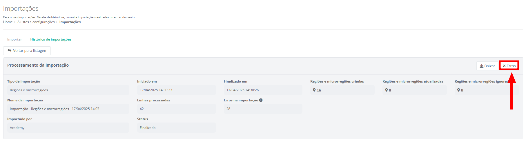Caso tenha ocorrido erros na sua importação, você poderá baixar uma planilha com todos os erros identificados.