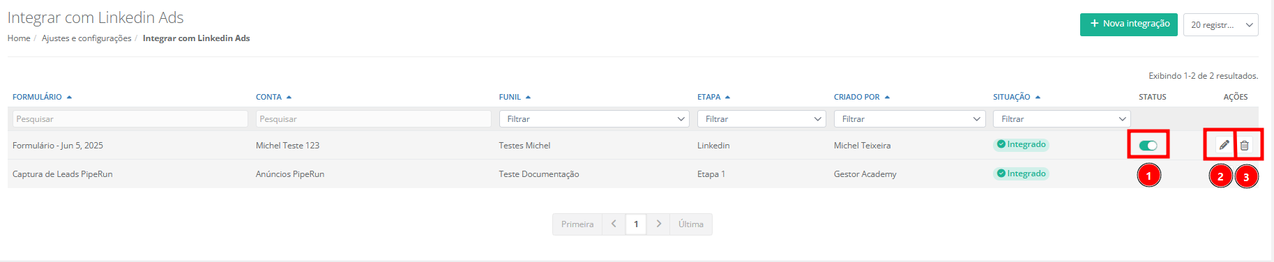 9. Na tela de integração é possível visualizar todas as integrações realizadas, além de ativar ou desativar (1), editar (2) ou excluir (3) cada uma delas.
