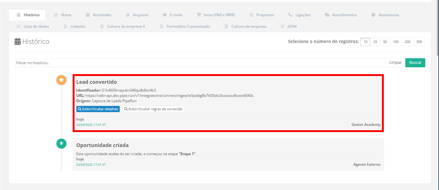 5. Após fazer o envio será criada uma oportunidade no funil e etapa informados durante as configurações de integração. Dentro da oportunidade na aba "Histórico" é possível verificar a origem dos dados recebidos.