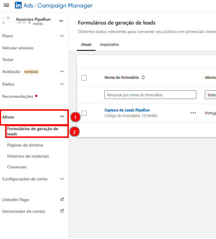 2. No menu à esquerda clique em "Ativos" (2) e a seguir em "Formulário de geração de leads".