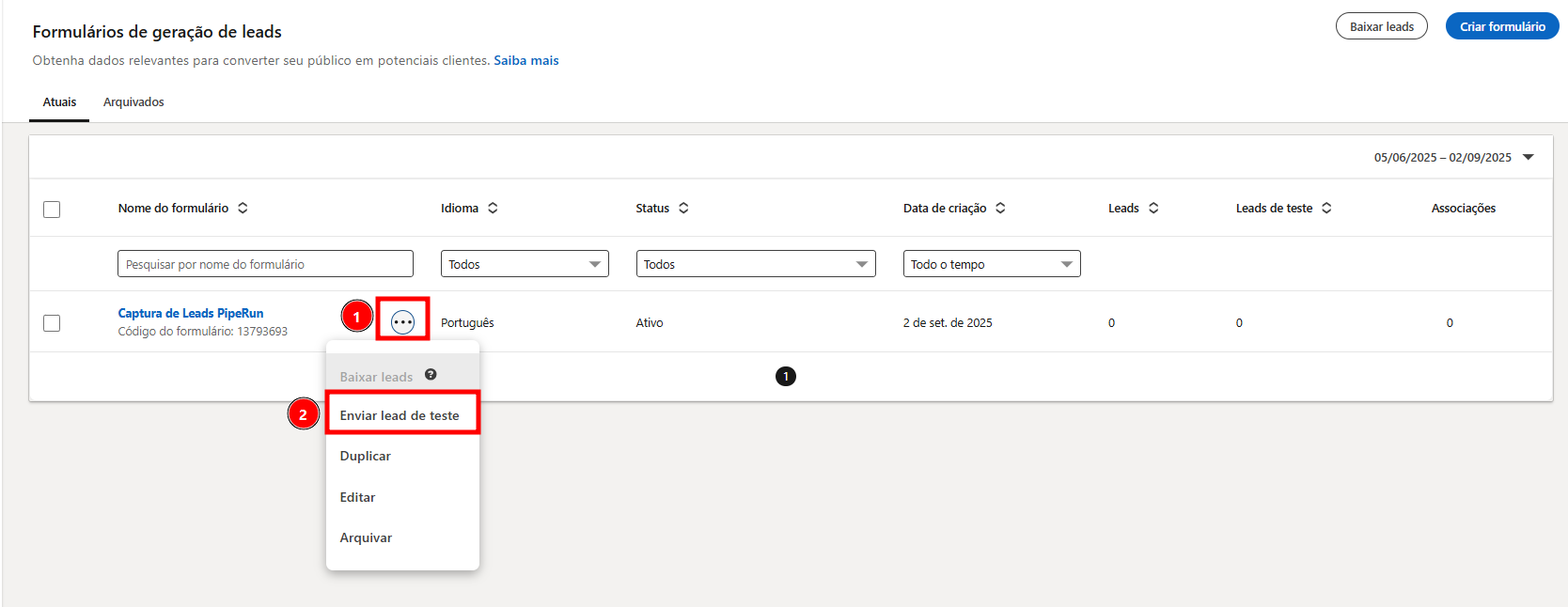 3. Clique no ícone de três pontos (1) ao lado do formulário, e a seguir em "Enviar lead de teste".