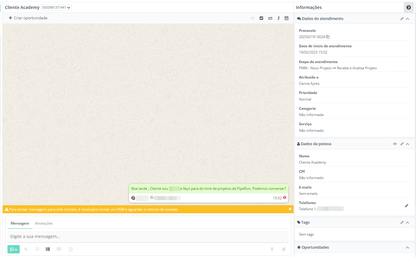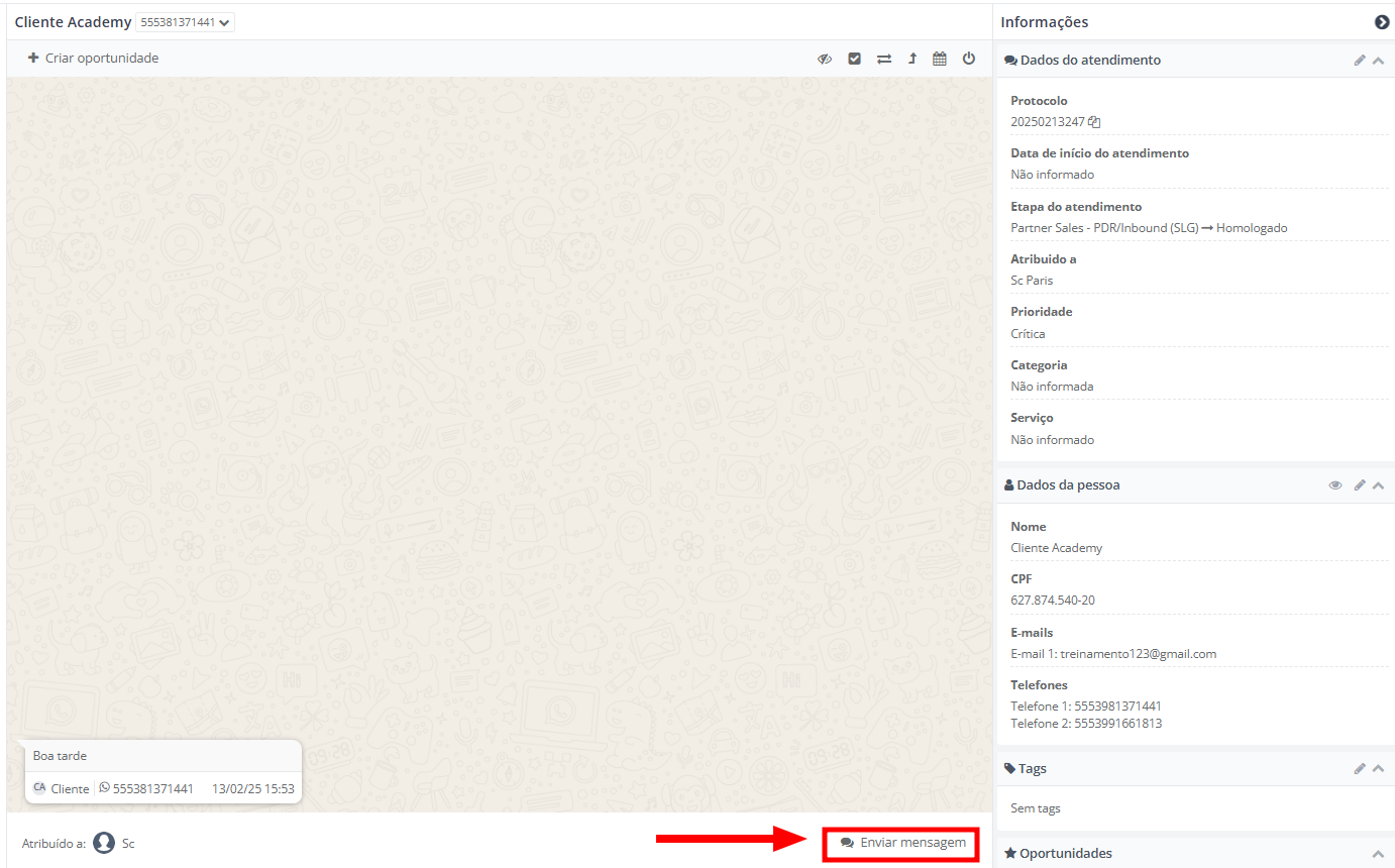 Atenção! Se você for o gestor, consultor com acesso geral e consultor líder de equipe, poderá intervir em atendimentos que estão atribuídos a outros atendentes. Clique em "Enviar mensagem" para habilitar a barra de mensagens e iniciar a interação com o cliente.
