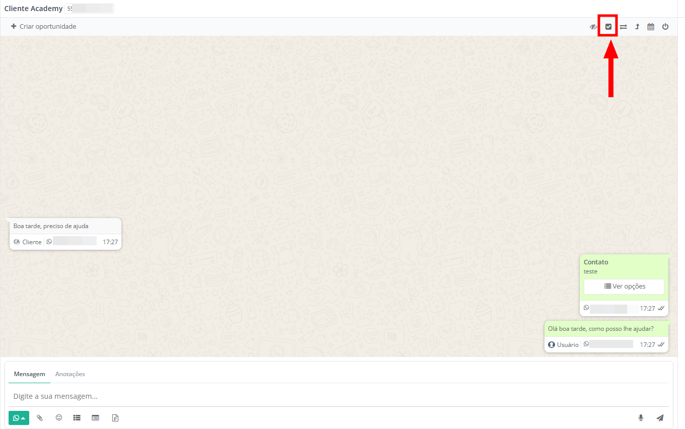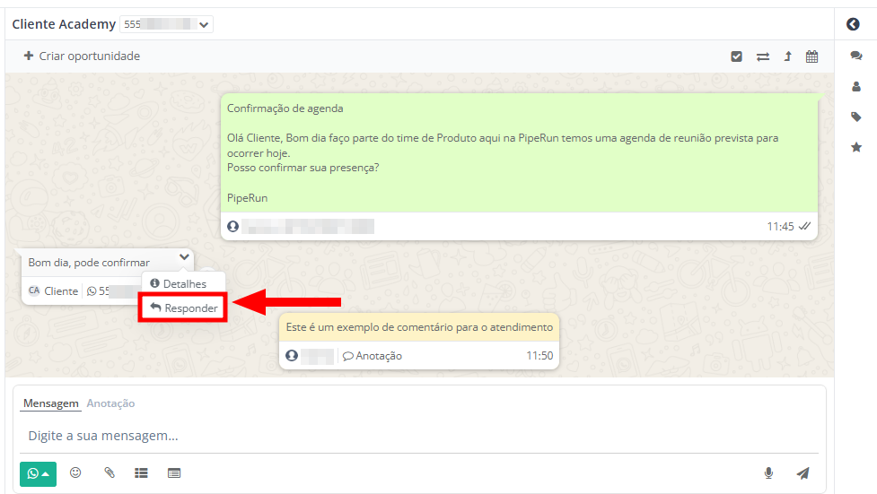 Dica: estas anotações não ficam visíveis para o cliente e podem ser utilizadas para fazer comentários ou anotações nas conversas realizadas.