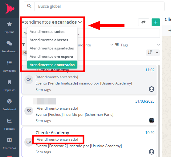 - Encerrados: exibe conversas que foram finalizadas pelo atendente.