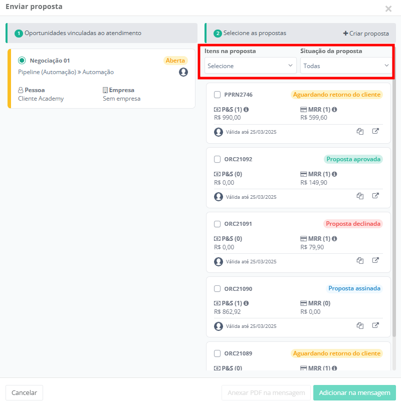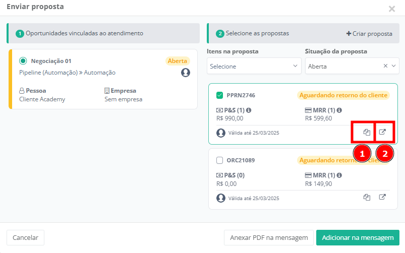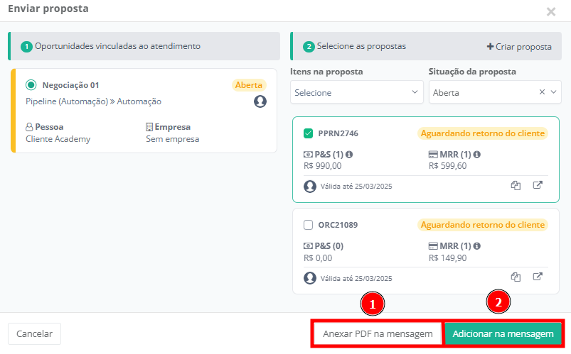 6. Após selecionar as propostas que deseja enviar , clique em "Anexar PDF na mensagem" (1) ou "Adicionar na mensagem" (2).