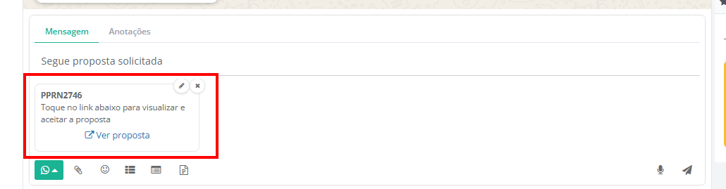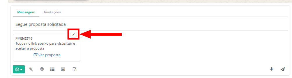Dica: clique no ícone de edição (lápis) para alterar tanto o conteúdo da mensagem que será enviada com a proposta quanto o nome do botão que acompanha a mensagem.