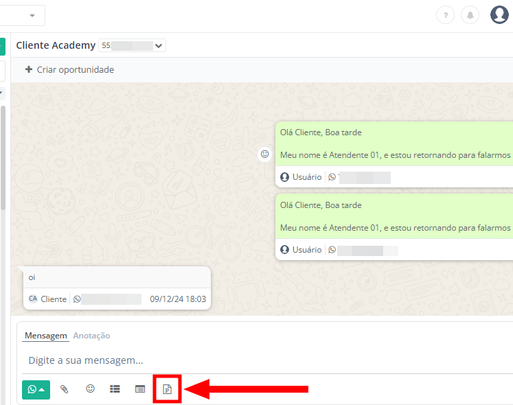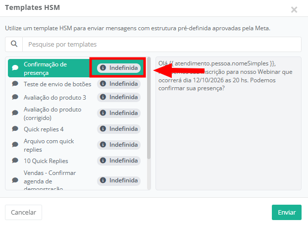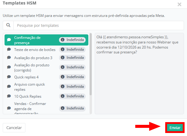 Dica: as mensagem HSM devem ser previamente cadastradas para que o atendente possa utiliza-las. Para saber como cadastrar mensagens HSM acesse este artigo.