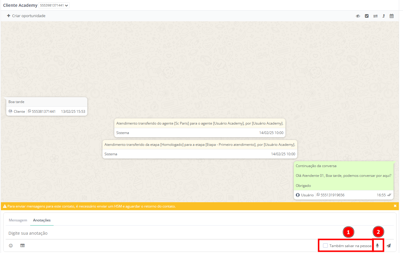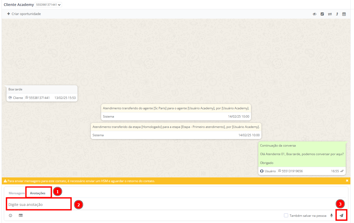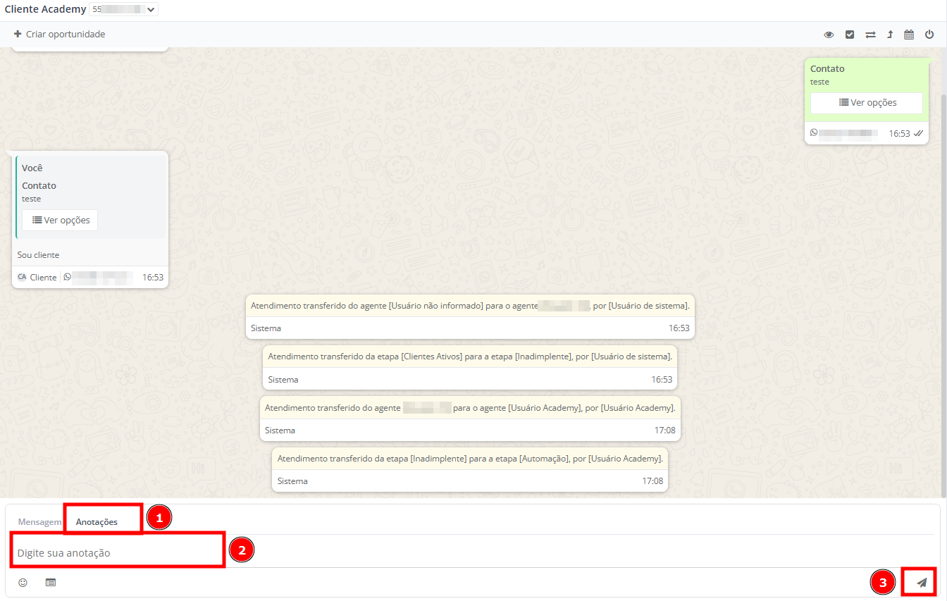 1. É possível também inserir anotações na conversa. Para inserir uma anotação na conversa clique em anotações (1) digite a sua nota (2) e clique em "Enviar"(3)