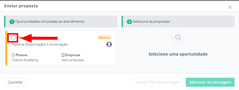2. Selecione a oportunidade que está vinculada ao atendimento e que contenha as propostas que deseja enviar.