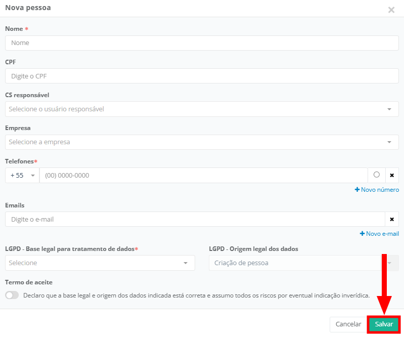 6. Na tela de cadastro, informe o nome do contato, telefone e informe a base legal para o tratamento de dados. Caso desejar, informe os demais campos disponíveis. Após o preenchimento, clique em "Salvar".