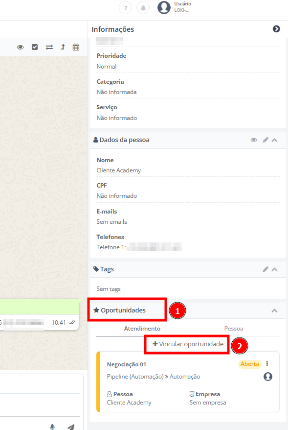Dica: na lateral direita da tela, clique em “Oportunidades”(1) e depois em “+Vincular oportunidade”(2) para associar a oportunidade ao atendimento e enviar a proposta correspondente.