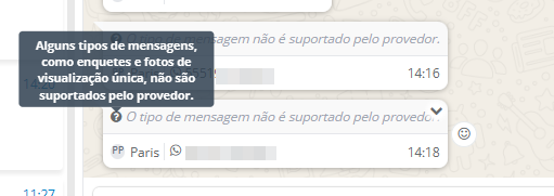Dica: alguns tipos de mensagens enviadas pelo cliente não são suportadas pelo META como Enquetes e fotos temporárias. Ao receber uma mensagem deste tipo o atendente vai visualizar a seguinte aviso na tela do atendimento.