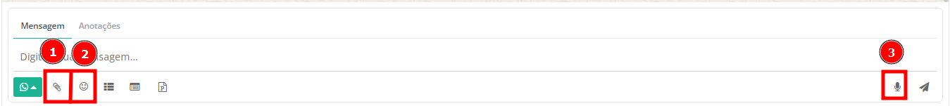 3. Além das mensagens de texto, é possível , enviar arquivos "anexos" (1), enviar "emojis" (2) e também enviar mensagens de "áudio" (3).