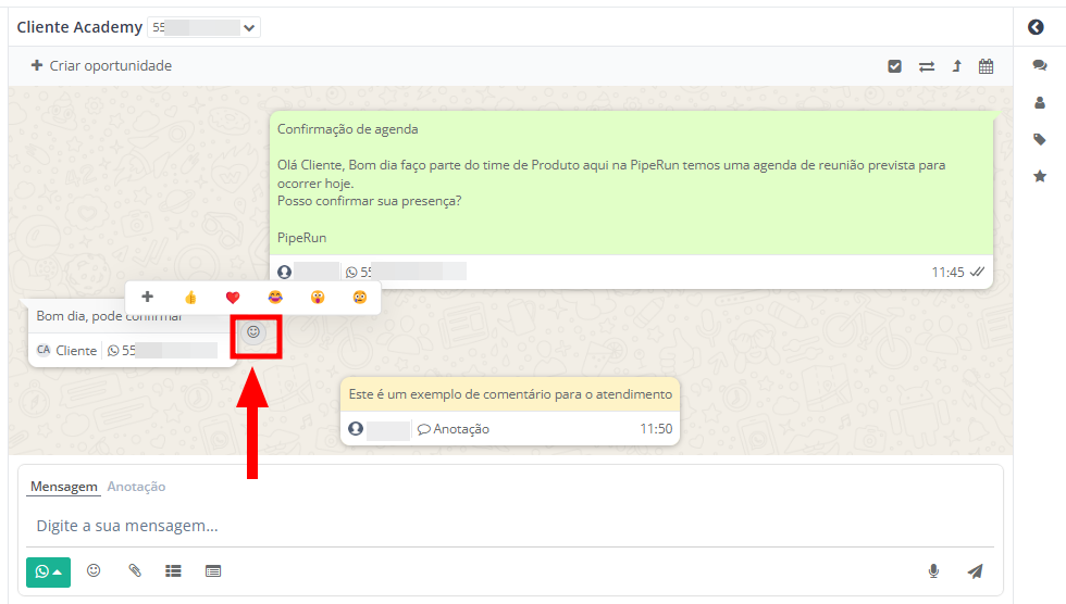 5. Também é possível reagir a uma mensagem recebida. Clique no ícone de emoji ao lado da mensagem recebida.