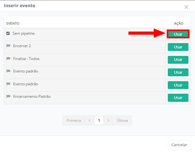 2. A seguir selecione qual evento deseja inserir na conversa clicando em "Usar".