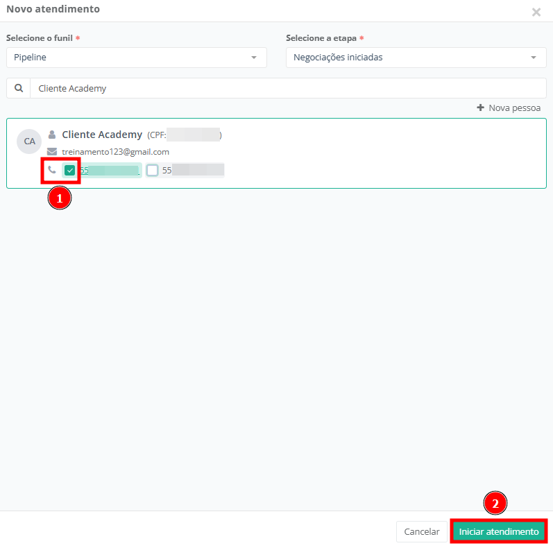 4. Após localizar o contato, selecione o número de telefone (1) que deseja iniciar o atendimento. A seguir, clique em "Iniciar atendimento"(2).