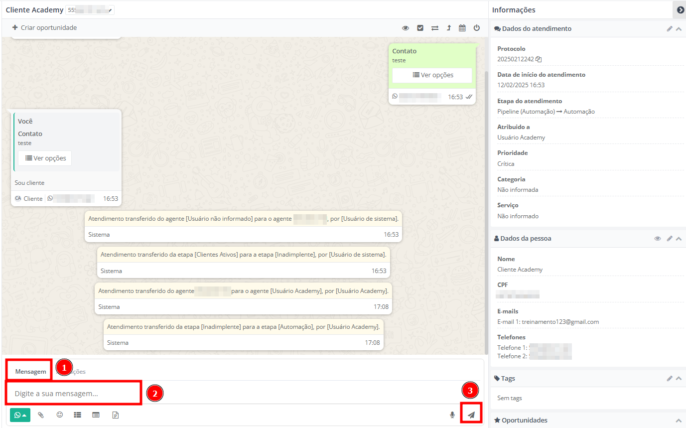 1. Na tela do atendimento, clique em "Mensagem" (1) a seguir, digite a mensagem que deseja enviar ao cliente na caixa de mensagens (2). Para enviar clique em no ícone para "Enviar" (3).
