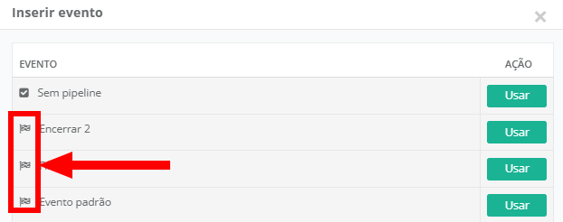 Os eventos que finalizam atendimentos tem ao lado do nome do evento o símbolo de uma bandeira.
