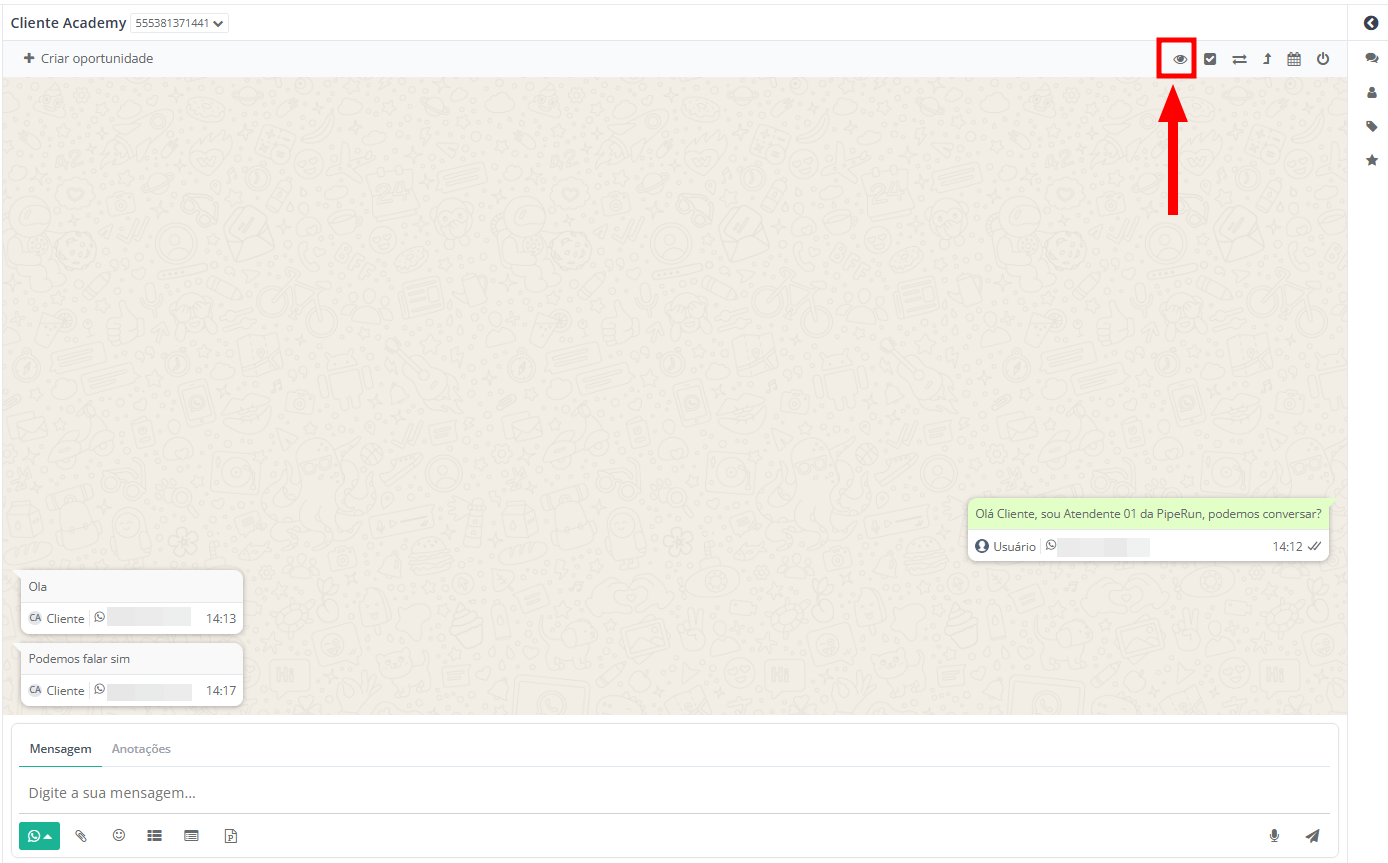 1. Para marcar uma conversa como não lida, clique no ícone do olho, conforme imagem.
