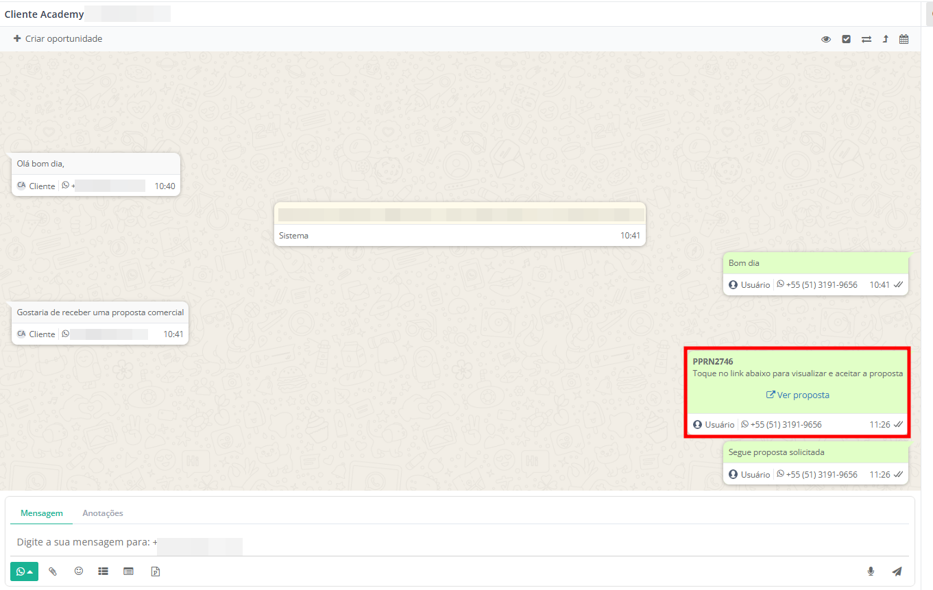 8. Selecionado a opção "Adicionar na mensagem", a proposta será enviada como uma mensagem um botão para o cliente clicar e ver a proposta.