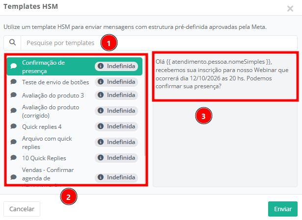 8. Na tela de mensagens HSM será apresentada as mensagens que já foram pré-cadastradas. É possível pesquisar um template pelo nome (1) ou selecionar o template na lista (2). Ao lado direito da tela (3), visualize a prévia da mensagem que será enviada.