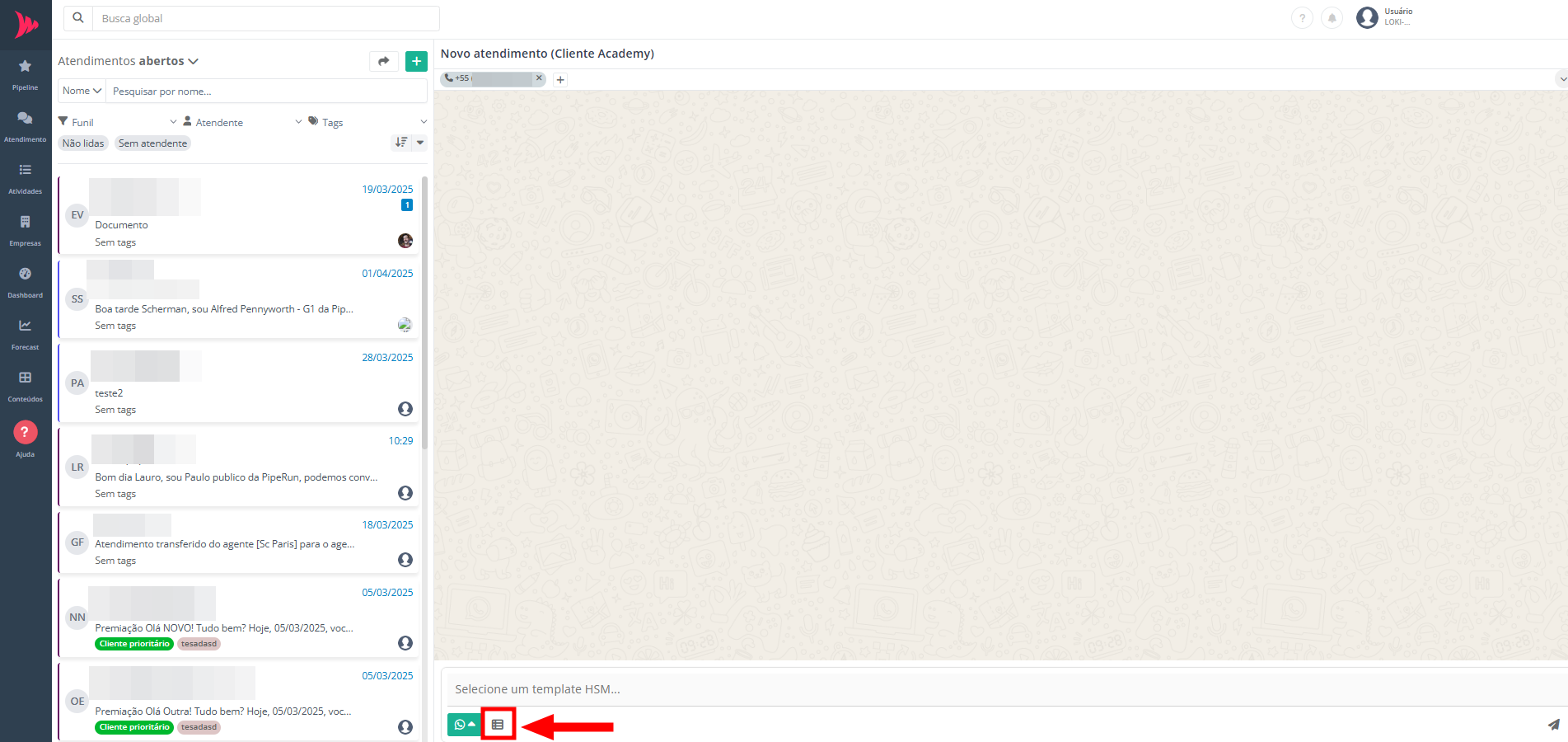 7. Para iniciar um novo atendimento será necessário enviar um template de WhatsApp (HSM). Clique em "Mensagem HSM" para selecionar uma mensagem HSM para ser enviada ao cliente.