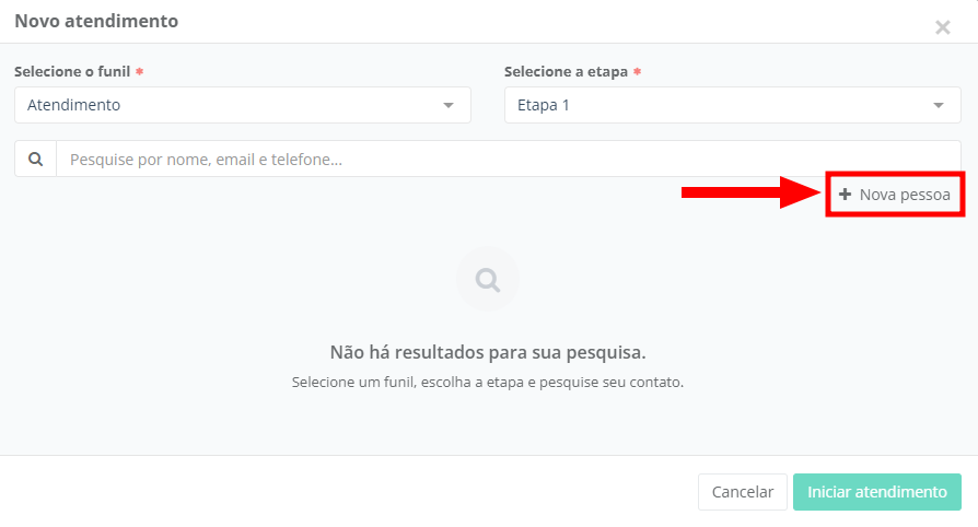 3. Em Novo atendimento, selecione o funil (1) e etapa (2) aos quais o atendimento será vinculado. Após, pesquise pela pessoa (3) ou adicione uma nova (4).