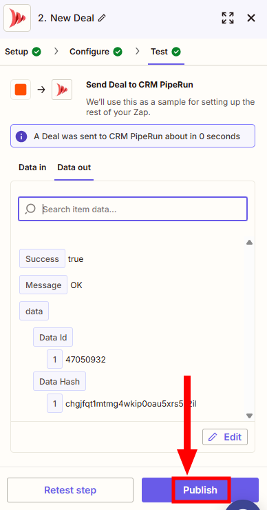 17. Para finalizar, na etapa Test navegue até o final da página e clique em "Test step". Aguarde até a tela do Zapier retornar a informação de que o teste foi enviado para sua conta do PipeRun.