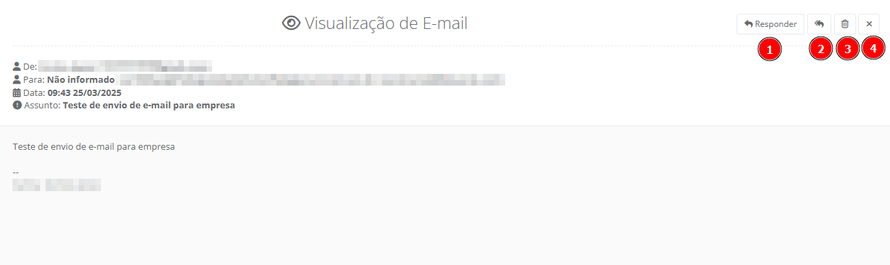 Ao clicar em Ler, será possível responder (1), responder a todos (2), Excluir (3) ou Fechar a visualização (4).