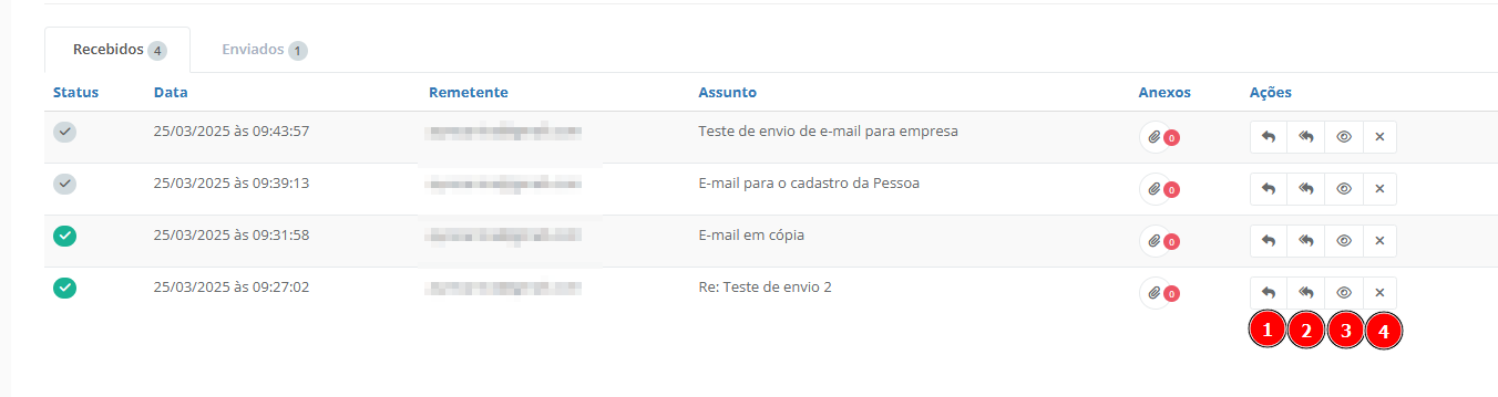 2. Na coluna ações, é possível responder (1), responder a todos (2), ler (3) ou remover (4) um e-mail.